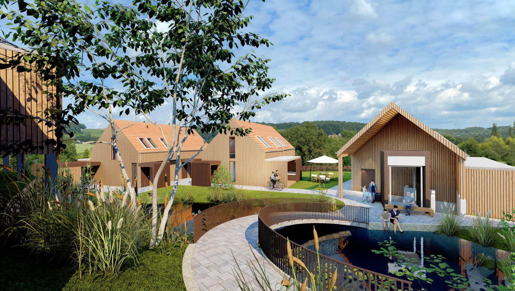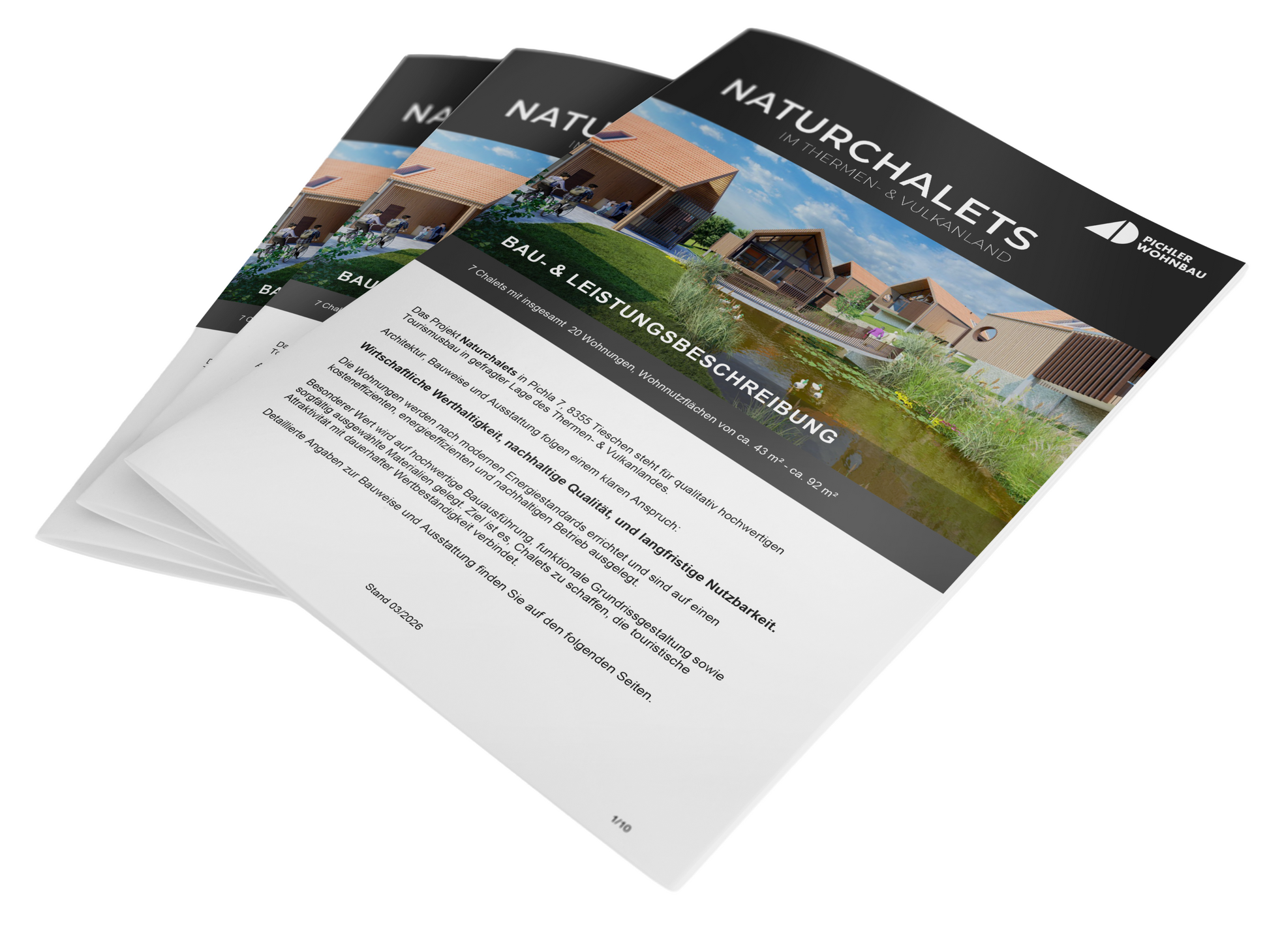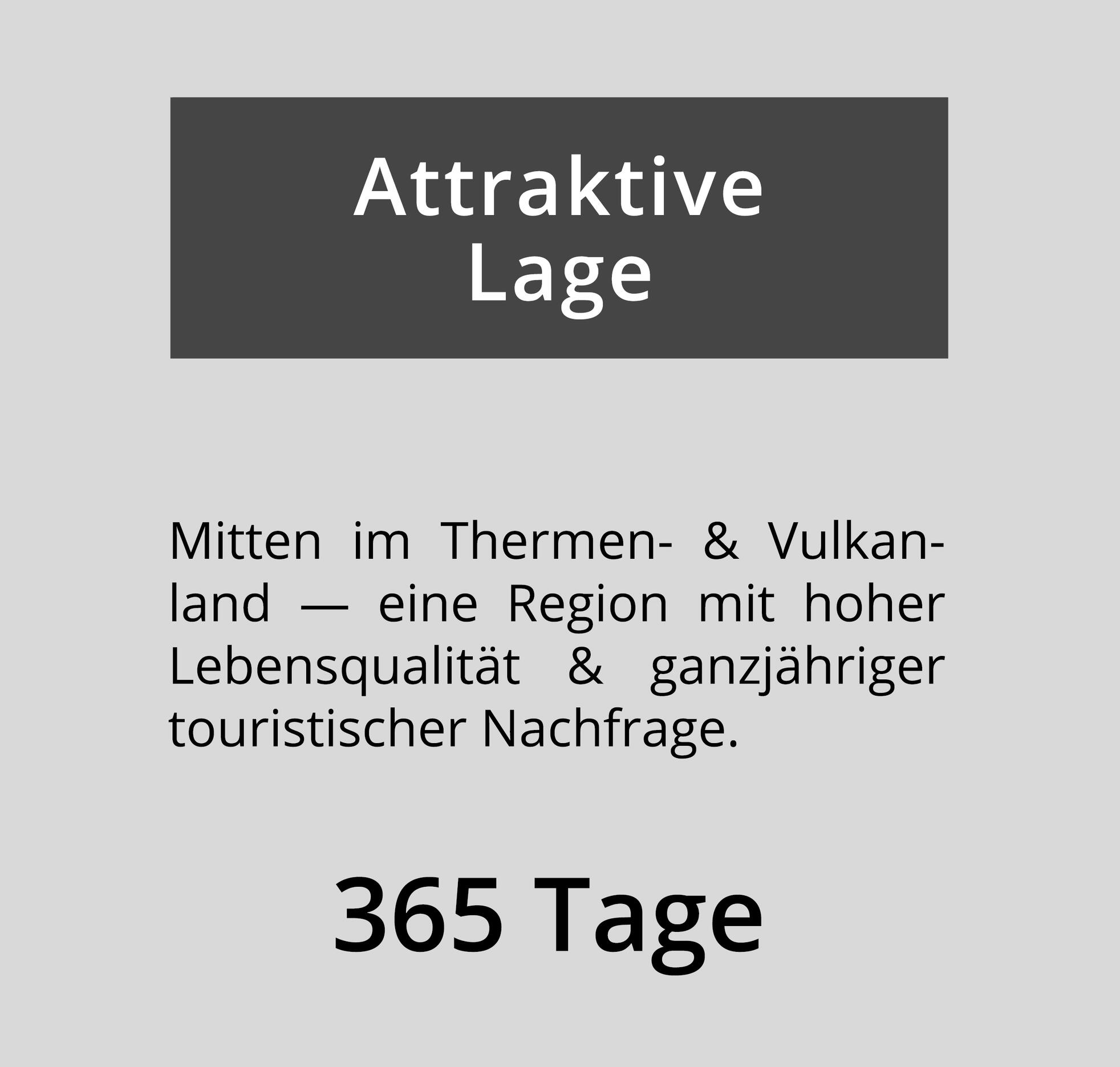 Ein kleiner Teich im Zentrum der Anlage unterstreicht die ruhige, harmonische Gesamtwirkung und wird zum verbindenden Element des Ensembles.Das Projekt ist bewusst überschaubar dimensioniert - kein großflächiger Ferienpark, sondern ein hochwertiges, stimmiges Gesamtbild, das sich selbstverständlich und sensibel in die Landschaft des Thermen- & Vulkanlandes einfügt.Neben der architektonischen Qualität überzeugt auch das klar strukturierte Nutzungskonzept: